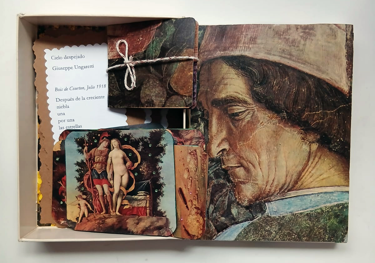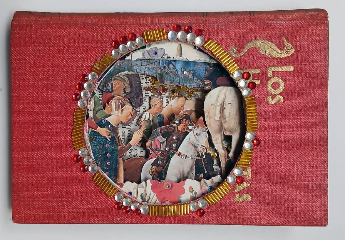 En esta serie de libros alterados, el libro deja de ser un objeto de lectura para convertirse en un pequeño escenario. A través de cortes sucesivos en las páginas, la estructura del volumen se transforma en un espacio profundo —casi teatral— donde las imágenes se despliegan en capas. Así, el libro se convierte en una máquina de memoria y ficción, y de homenaje a los grandes pintores del pasado El tamaña es 12 x 18 cms