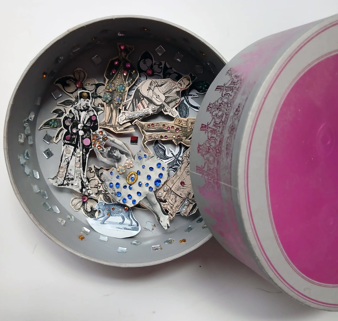Esta caja recupera personajes de siglo pasados, ubicados en superposición en distintos niveles, ornamentados con pedrerías mientras que en la superficie espejos en miniatura agregan reflejos y enriqeucen la textura. También en el interior de la tapa tres personajes sirven a manera de testigos de este paisaje humano caótico. La caja tiene 14 cms de diámetro y 5 cm de altura.