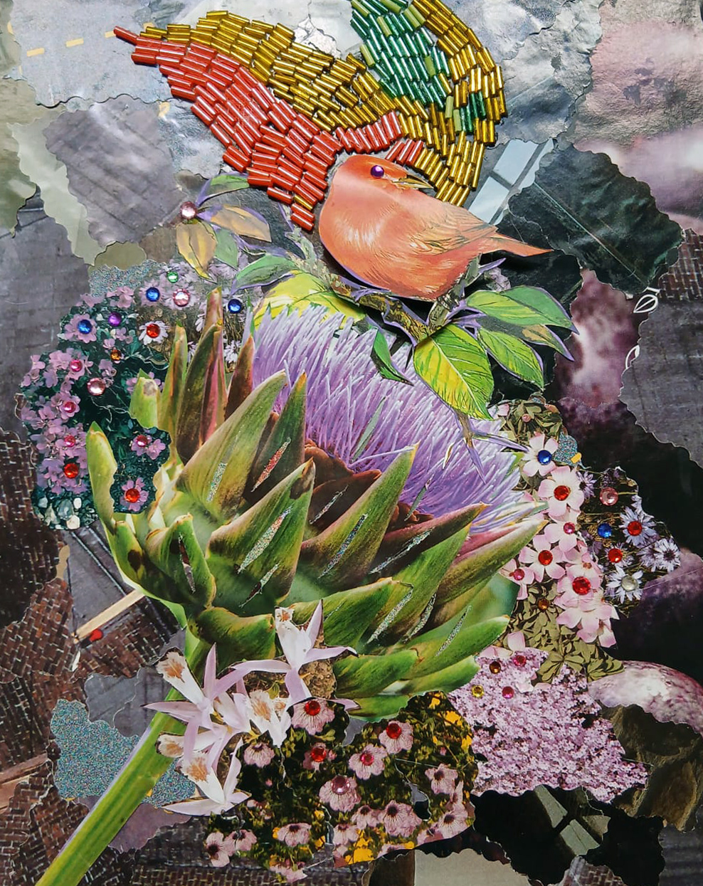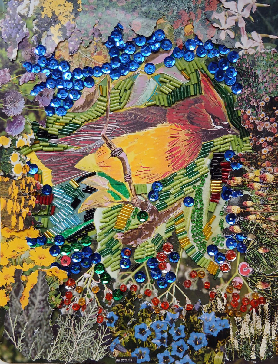 En estas piezas, la figura del ave aparece como presencia central, casi como un habitante simbólico de un territorio reconstruido. A su alrededor, la vegetación se expande en una proliferación de flores y hojas que evocan un jardín imaginario y exuberante. El relieve del collage y la incorporación de pequeños cristales generan destellos que recuerdan el brillo fugaz de la luz en la naturaleza.