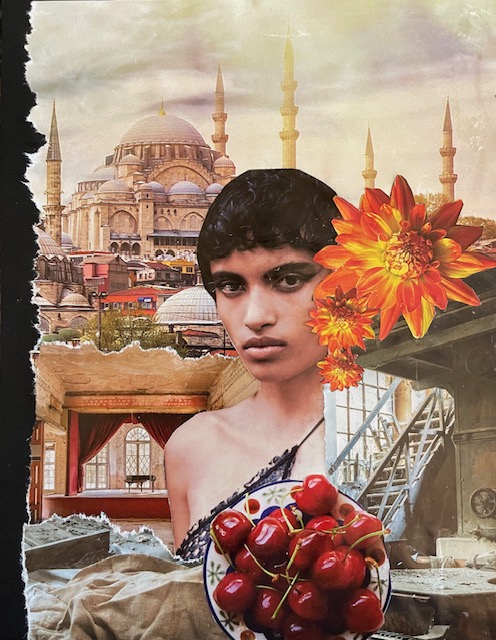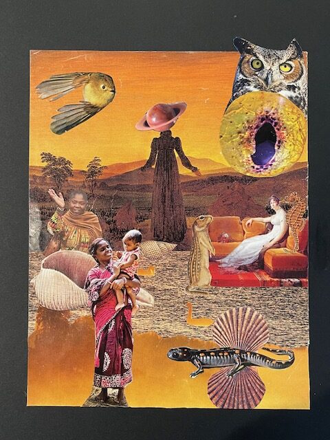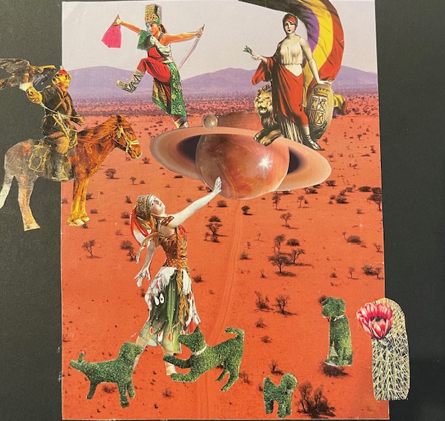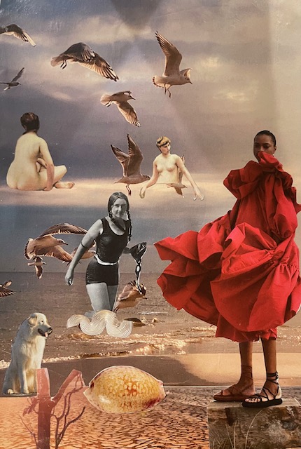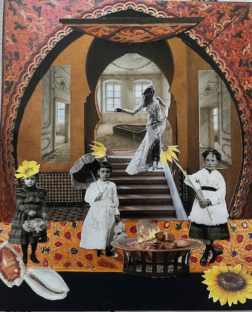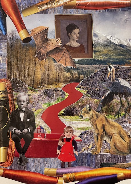 My preferred materials primarily consist of images sourced from magazines and books. Although I currently rely on existing visuals, my ultimate aspiration is to predominantly incorporate my own photographs. While constructing my collages, I prioritize the narrative I aim to convey and carefully consider the colors I wish to employ. I typically commence by selecting larger pieces and subsequently focus on refining the finer details. Although I often envision the final appearance of my collage, the end result frequently deviates significantly from my initial concept.