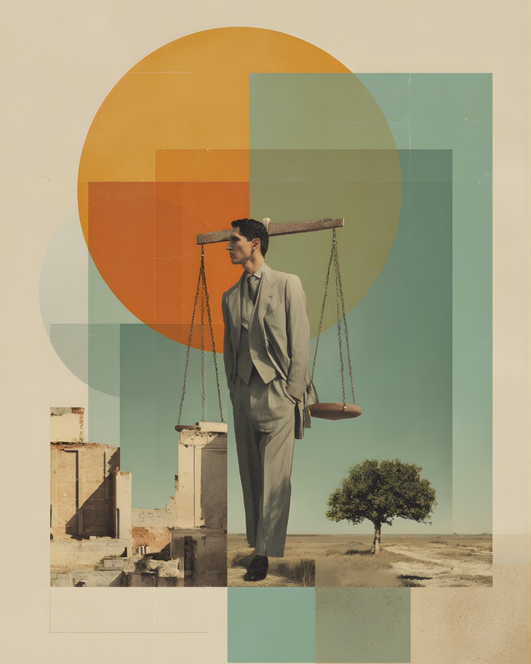 Una obra que explora la dualidad entre la sofisticación humana y la crudeza del entorno natural. La figura central, vestida con una elegancia atemporal, sostiene una balanza que parece medir el valor de lo construido frente a lo orgánico. Entre ruinas que evocan el pasado y un horizonte infinito, la pieza reflexiona sobre la responsabilidad del individuo en la creación de su propio destino. Una composición donde la geometría del color organiza un caos silencioso y poético.