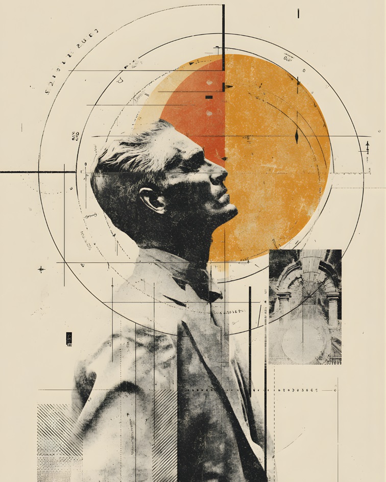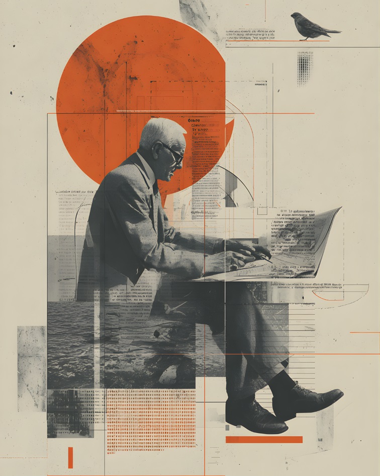 "Una exploración sobre la construcción de la memoria y el conocimiento. A través de la figura de un hombre inmerso en la lectura, la obra entrelaza planos arquitectónicos, texturas de prensa antigua y geometría contemporánea para representar cómo el pasado cimenta nuestra visión del presente."Collage contemporáneo, Arte visual, Arquitectura, Diseño editorial, Vintage, Geometría, Surrealismo, España, Fine Art, Memoria