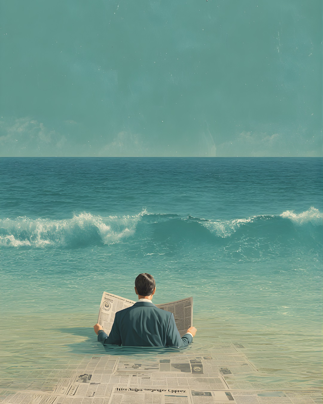 Esta pieza explora la relación entre el individuo y el flujo incesante de información en la era moderna. En un mundo saturado de noticias, el espectador se encuentra sumergido en un océano de titulares, donde la línea entre la realidad y la narrativa editorial se desvanece bajo las olas.