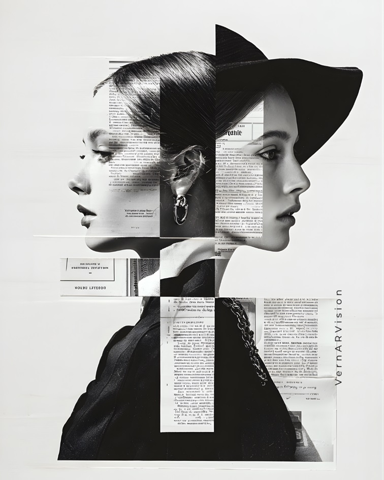 ¡ Una obra que explora la fragmentación de la percepción y el misterio de lo no dicho. A través de un juego de espejos visuales y recortes tipográficos, la pieza presenta dos facetas de una misma presencia: una expuesta y otra protegida bajo el ala de un sombrero. Es una reflexión sobre la elegancia del anonimato y la complejidad de la mirada humana, donde el blanco y negro acentúa la atemporalidad de la composición. Un cierre poético que celebra la sutileza y el equilibrio entre la luz y la sombra.